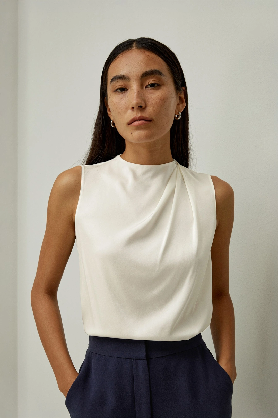 Entrez dans un monde de style raffiné avec notre topminimaliste sans manches, méticuleusement conçu pour allier simplicité et sophistication. Ce top élégant présente une encolure distinctive qui combine le col ras du cou classique avec un demi-col roulé chic, créant une apparence soignée et distinguée. Une couture d'épaule unique et délicatement plissée ajoute une touche de sophistication subtile, rehaussant l'allure générale du vêtement. Parfait pour les environnements professionnels et les occasions décontractées. Qu'il soit porté seul pour un profil élégant et contemporain ou comme couche de base polyvalente pour des ensembles variés, ce top est un ajout indispensable à votre garde-robe, adapté à chaque événement.